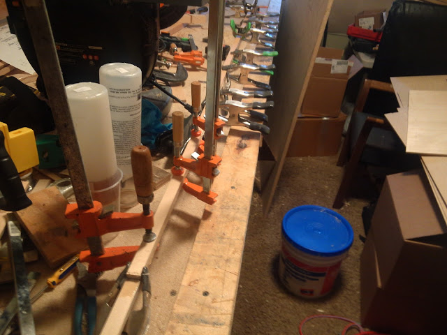 I brought my single piece of 1/16" 45 degree bias Baltic birch aircraft plywood to work today so I could cut it into 4" strips and cut scarf joints on the strips. These strips will be used for the shear webs on the canard spar. I figured it would be best to get this out of the way so I don't run out of things to glue this long holiday weekend.